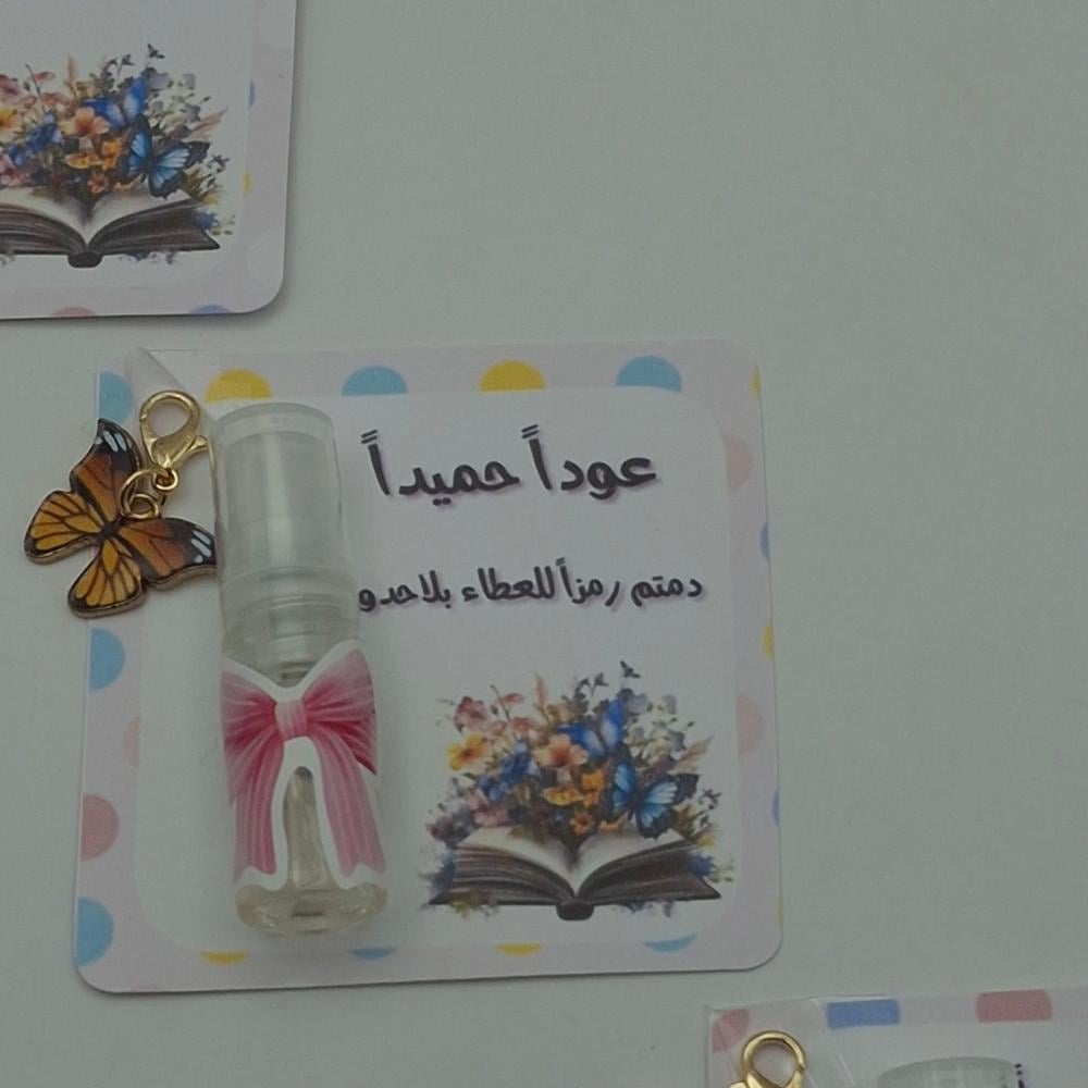 توزيعات اليوم الوطني عطر +ميدلية فراشه او قلب بشكل عشوائي+هدية استيكر